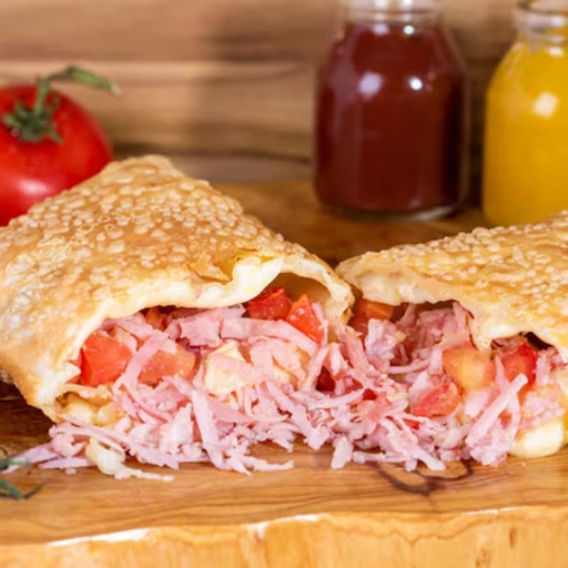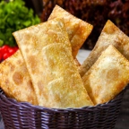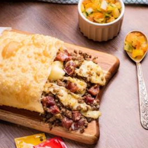Pastel de cuscuz, Catupiry, cheddar, carne do sol, charque, bacon, muçarela, milho e ervilha